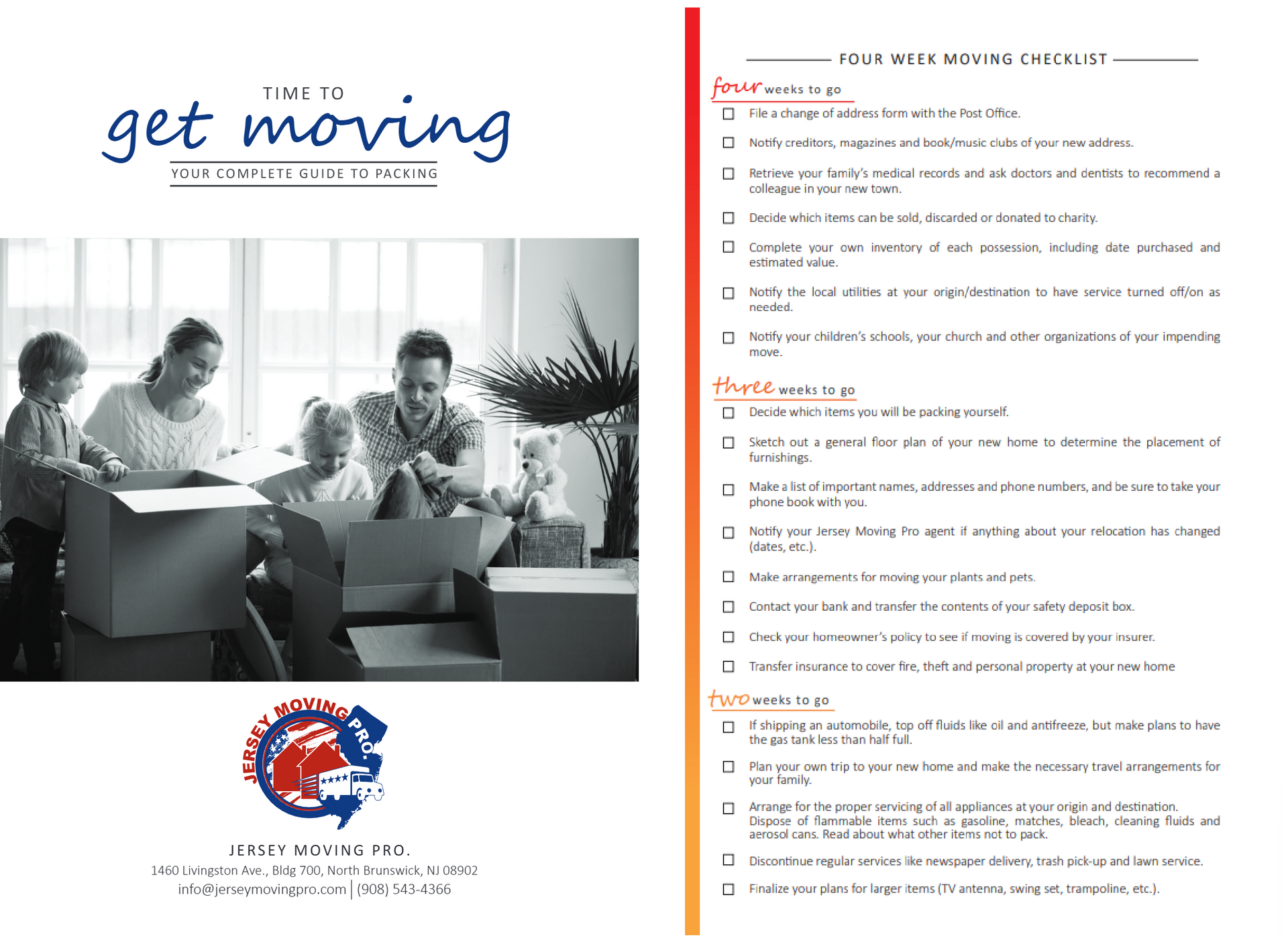 - Notify your Jersey Moving Pro agent if anything about your relocation has changed (dates, etc.).